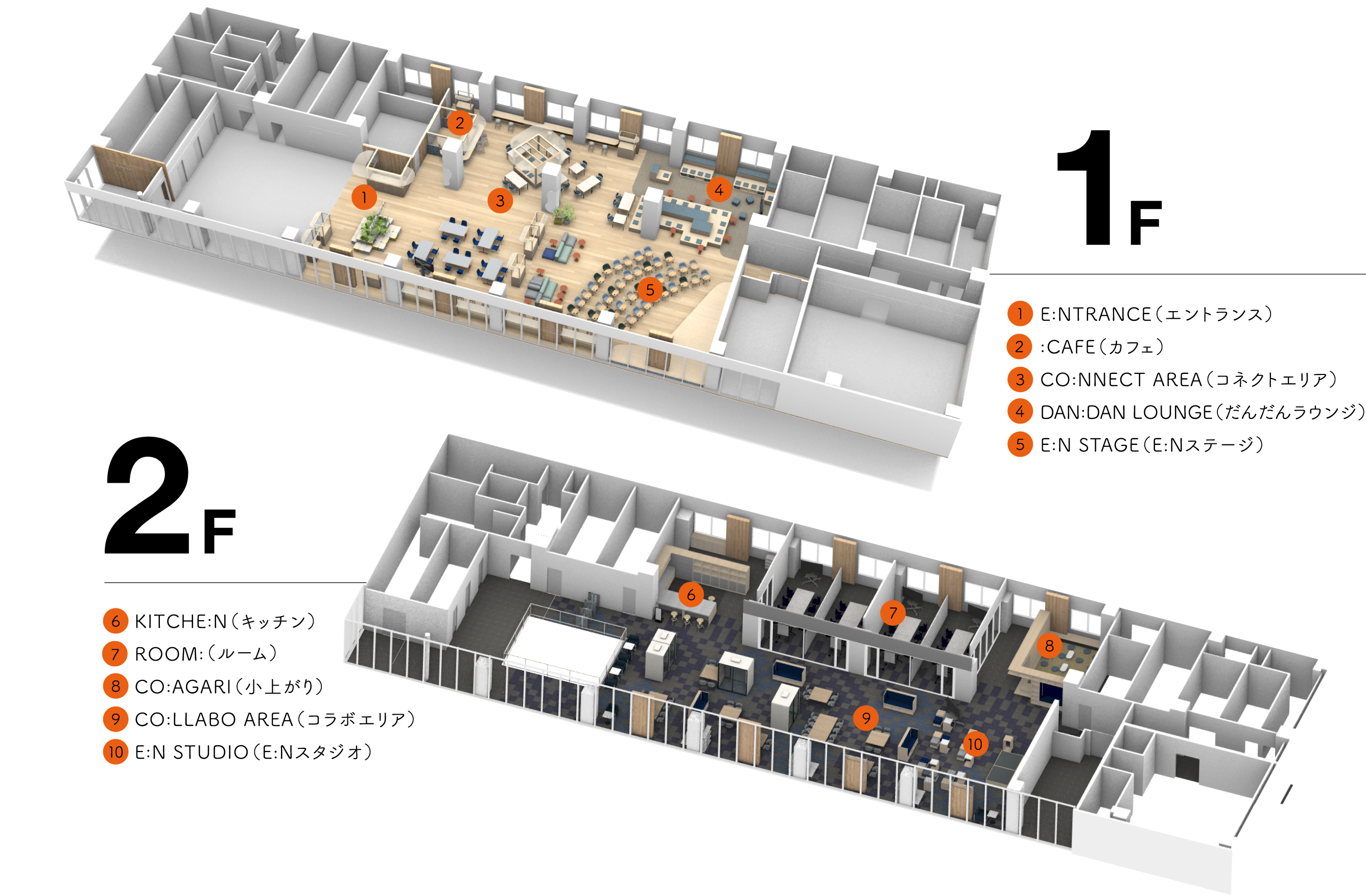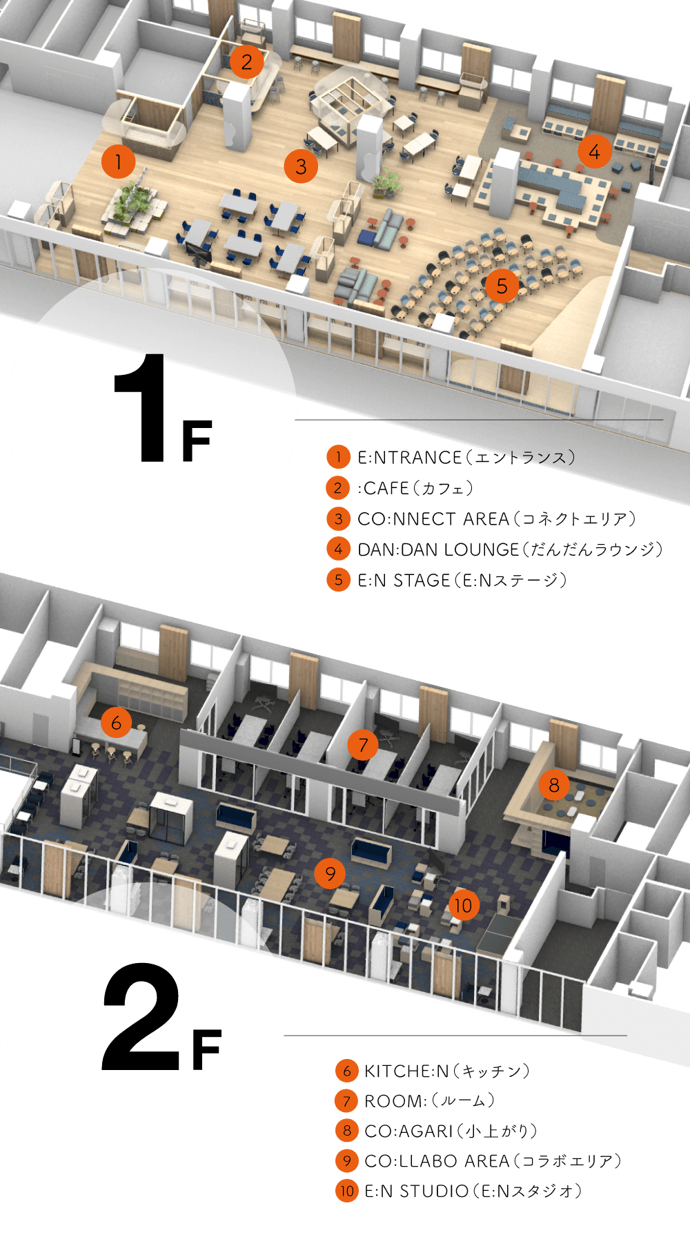 - 「E:N BASE」という名称には、多様な主体が出会い、つながることで、共創の“エン”(縁・円)を生み出し、広げていく拠点でありたいとの思いを込めています。「E」は愛媛の頭文字、そして「N」は「Next(次代)」や「Node(接点)」などのさまざまな可能性を含み、これらをつなぐコロン(:)は、“つながり”の象徴です。ロゴは、愛媛のイメージや前向きさを感じる色を基調に、形や大きさの異なる円が重なり合って新たな円をかたちづくる姿を描き、 共創を通じて多様な主体が新しい価値を生み出す様子を表現しています。